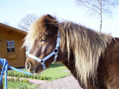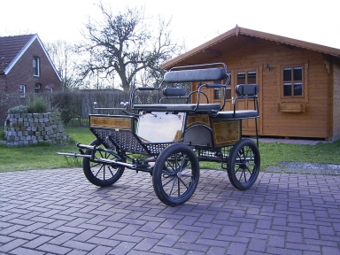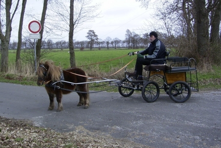 In den kleinen Shetland Ponys steckt mehr Kraft als die Größe überhaupt vermuten lässt. Es ist eine herausragende Besonderheit, dass diese kleinen Ponys im Verhältnis mehr Gewicht ziehen können als ein großes Pferd. Diese Besonderheit ist darauf zurückzuführen, dass ein Shetlandpony im Gegensatz zu anderen Pferderassen die Last mit der Kraft der Hinterbeine vorwärts drückt. Somit ist es in der Lage das Doppelte seines Eigengewicht zu ziehen (ein Pony von 200 kg kann also bis zu 400 kg ziehen). Durch die geringe Größe bildet das Pony mit Hals und Rücken zu den Zugsträngen eine nahezu parallele Linie und erreicht eine optimale Zugrichtung, wie es größeren Pferden nicht möglich ist. (Wissenschaftliche Erforschung von Dr. Erich Flade, erfahrener Shetland- Pony Experte). Wichtig ist es natürlich, dass man sich eine gute nicht zu schwere Kutsche anschafft, die von den Proportionen her gut zu den kleinen Shettys passt. Vorraussetzung ist natürlich noch, dass Fahrer und Pony eine gute Fahrausbildung haben und das Geschirr von guter Qualität ist und selbstverständlich auch passt. Denn wie gesagt, die große Kraft der Kleinen darf nicht unterschätzt werden!!! Wenn alle Voraussetzungen gegeben sind ist das Kutsche fahren mit den kleinen Shettys eine wundervolle Freizeitbeschäftigung. Shettys anzuspannen und mit ihnen die Natur zu geniessen ist ein ganz besonderes Hobby! Was ein Shetty einmal gelernt hat verlernt es so schnell nicht wieder. Wenn wir unseren Wallach eine Weile nicht angespannt haben, läuft er doch so selbstverständlich im Geschirr als wäre er gestern noch Kutsche gefahren.