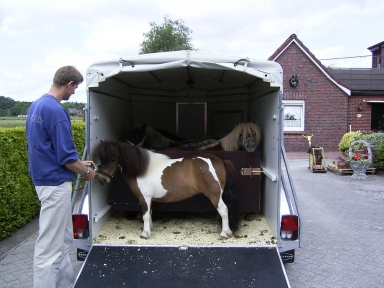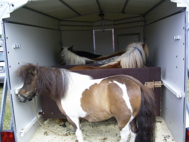 Um unsere Minis sicher transportieren zu können, haben wir unseren Pferdeanhänger extra der Minishetty- Größe angepaßt. Mit selbsteingebauten, verstellbaren Trennwänden haben wir der Ponygröße entsprechende Querboxen, damit die Shettys während der Fahrt sicher stehen